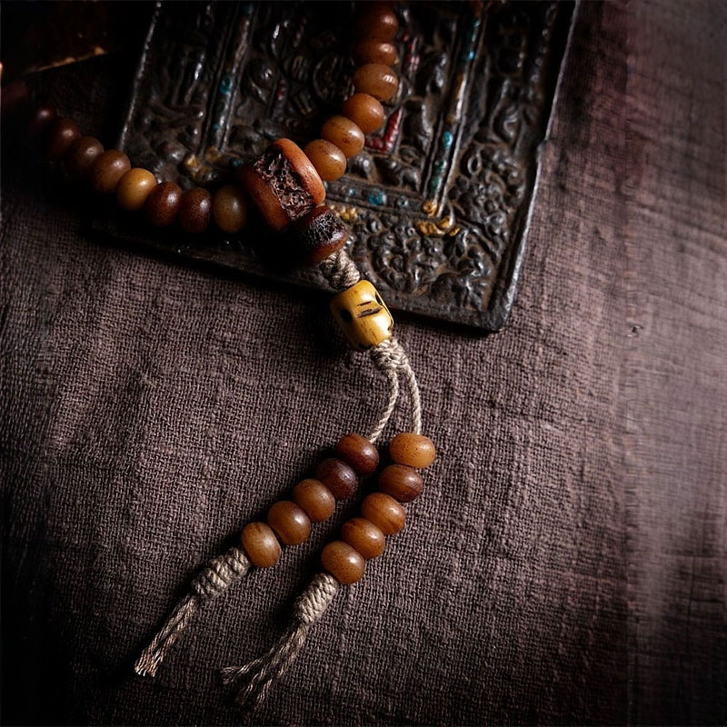 Crafted from well-aged, full-grown yak bone, this 108-bead Tibetan mala carries the quiet weight of time and use. Compared with ordinary bone materials, the naturally rich oil content reveals deeper pores and more pronounced grain, giving each bead a warm, earthy tone and a grounded, substantial feel in the hand. This version is thoughtfully accented with a Gaga waist bead and sandalwood spacer beads, creating a slightly longer overall length. Every detail is chosen with intention, not for excess, but for harmony. A mala meant not only for counting mantras, but for slowing the breath, steadying the mind, and accompanying everyday moments with quiet presence.