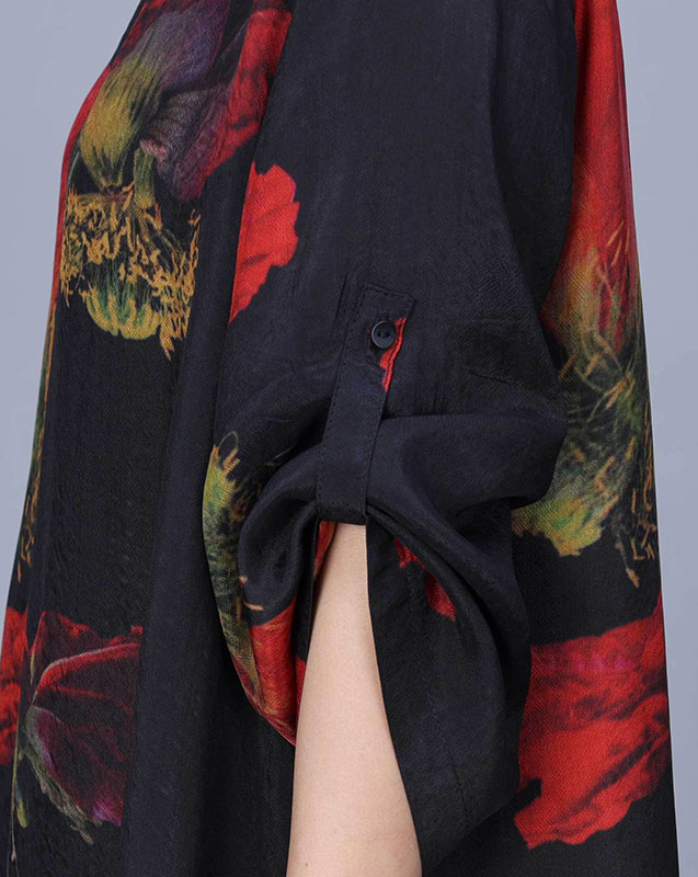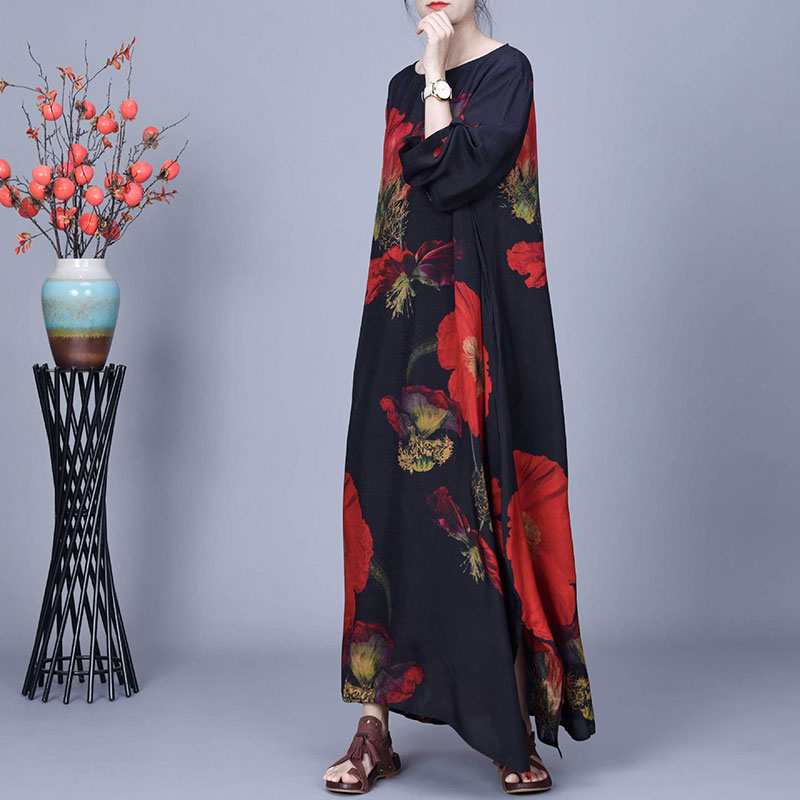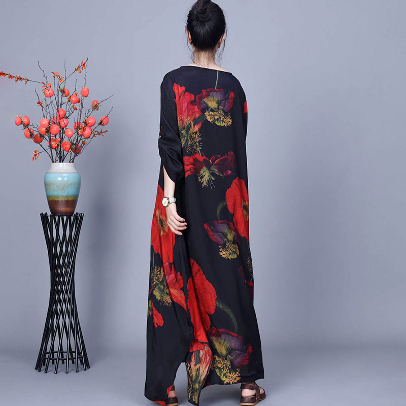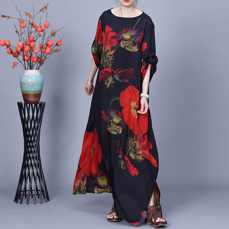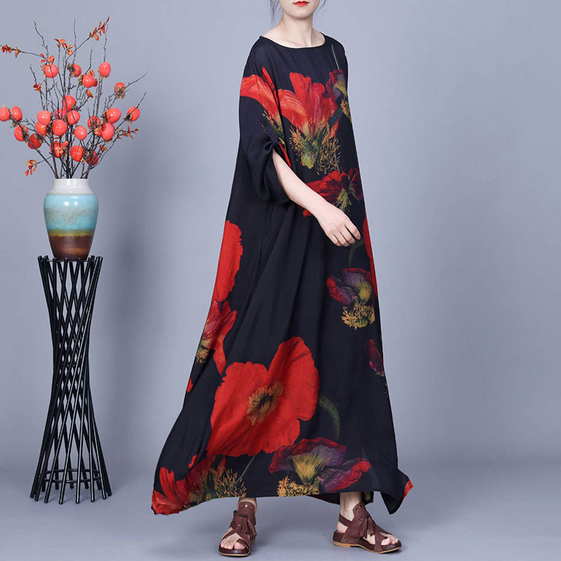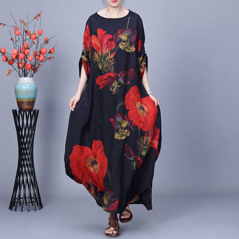 Item's name:Red Huge Flowers Black Maxi Cocoon Dress